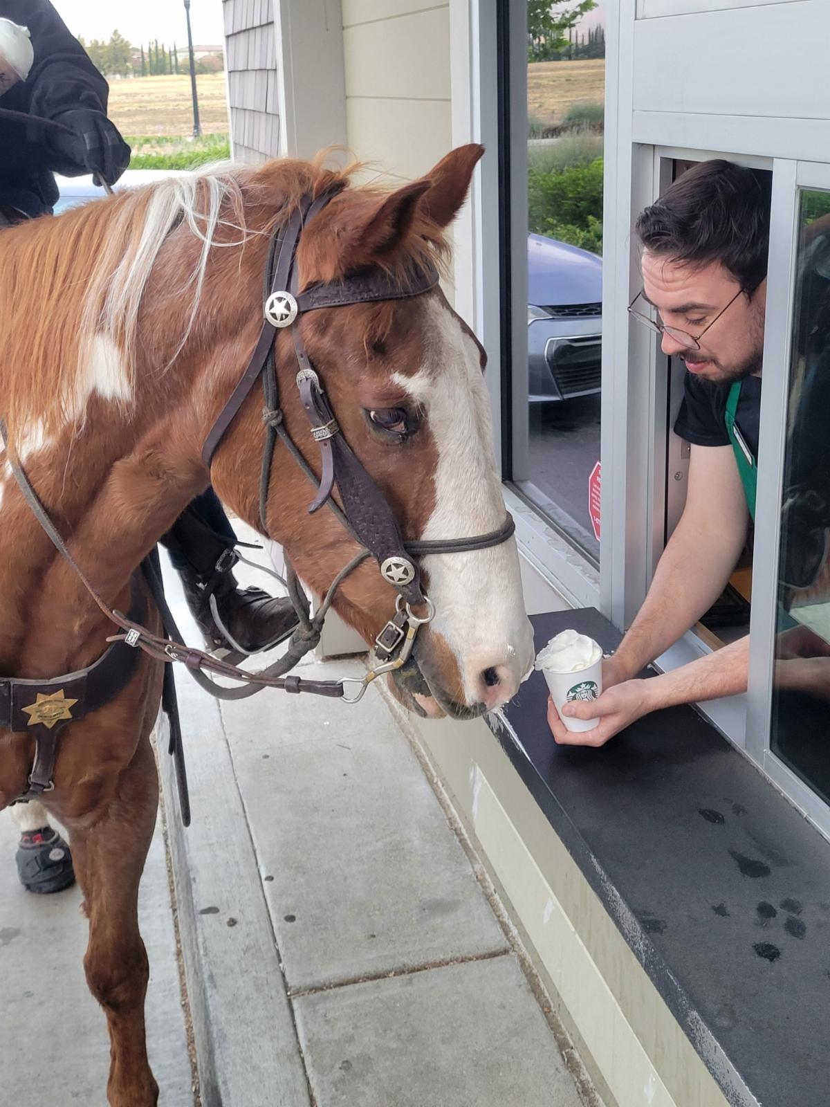 And speaking of connections—turns out, officers aren’t the only ones who enjoy a caffeine stop! Our Mounted Patrol made a quick detour for a “horse-sized” treat at the drive-thru. Let’s just say this four-legged officer neighed his approval.